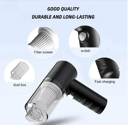 ¿Cansado del polvo en tu auto, escritorio o sofá? Con la Aspiradora de Mano Recargable Inalámbrica, limpiar será más rápido, cómodo y práctico que nunca. Su diseño compacto y sin cables te permite llevarla a cualquier lugar: el carro, la oficina o incluso tu rincón de estudio.